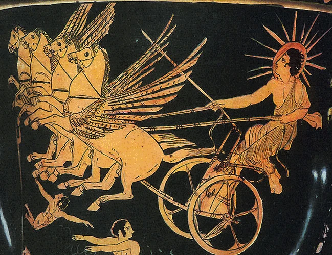 Hélios representado em um vaso grego dirigindo a biga solar.