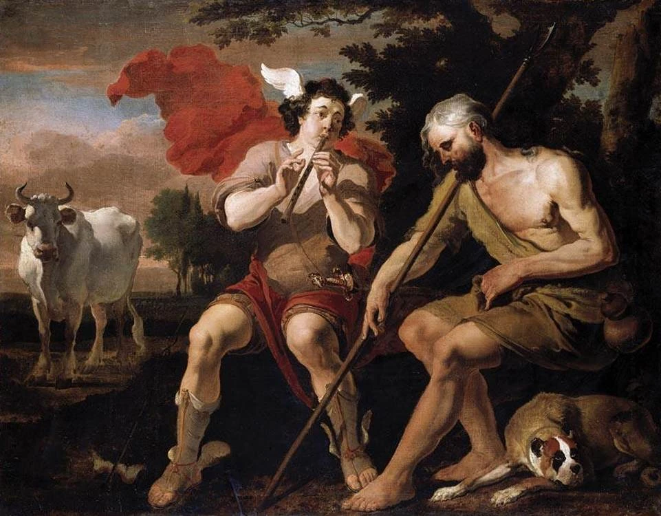 - Hermes, filho de Zeus e de Maia, nasceu em uma caverna da Arcádia. Logo após o nascimento, a mãe enfaixou-o e o pôs a dormir em um cesto, no vão de um salgueiro. Sem que ninguém percebesse, Hermes soltou-se de suas faixas, fugiu e se dirigiu à Tessália, onde roubou várias cabeças de gado do rebanho de Admeto, ao qual Apolo havia sido condenado a servir. Conduziu o gado por quase toda a Hélade, tendo amarrado folhudos ramos em suas caudas, para que apagassem o próprio rastro e o escondeu em Pilos, na Messênia, onde sacrificou duas novilhas, dividindo-as em doze partes, embora os olímpicos fossem, então, apenas onze: ele mesmo se promovera a décimo-segundo. Tendo encontrado uma tartaruga à entrada da caverna, matou-a, arrancou-lhe a carapaça e, com as tripas das novilhs sacrificadas, fabricou a primeira lira. Voltou à sua caverna antes do dia terminar, deitou-se e ficou bem quietinho no cesto. Apolo, versado em adivinhações, descobriu a identidade do astucioso ladrão. Ao se queixar do roubo, a mãe negou, apontando-lhe a criança enfaixada e quieta na cesta. Mas Apolo viu o couro dos animais sacrificados, não teve mais dúvidas e apelou a Zeus. Este interrogou o filho, que persistiu na negativa, mas acabou por ceder e ser obrigado a prometer que nunca mais faltaria com a verdade - fazendo a ressalva de que não se obrigaria a dizer a verdade por inteiro. Apolo encantou-se, porém, com o som da lira e acabou por trocar o rebanho furtado pelo novo instrumento.