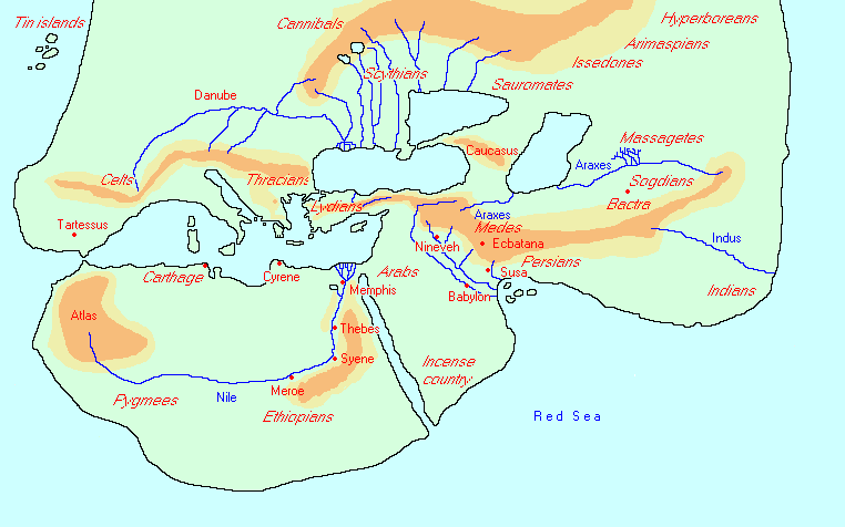 Reconstrução do mapa-múndi de Heródoto, com os hiperbóreos no extremo norte-oriental