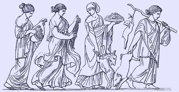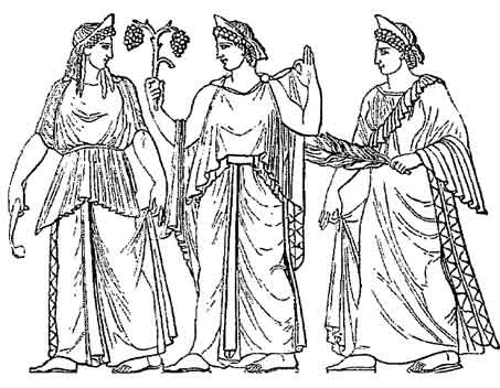 Na versão ateniense, possivelmente mais arcaica, as Horas, cultuadas pelos camponeses, eram representadas como jovens rodeadas de flores coloridas, vegetação e outros símbolos de fertilidade. Eram três, representando diretamente as três estações de quatro meses originalmente reconhecidas pelos gregos, a saber, primavera, verão e outono: