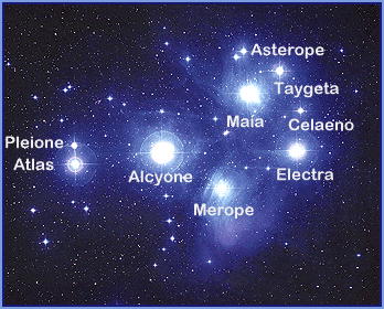 No aglomerado estelar, seis das estrelas são claramente visíveis, enquanto a sétima, Mérope, é mais apagada - segundo o mito, está envergonhada porque enquanto todas as irmãs foram amantes de deuses, Mérope foi amada por um simples mortal.