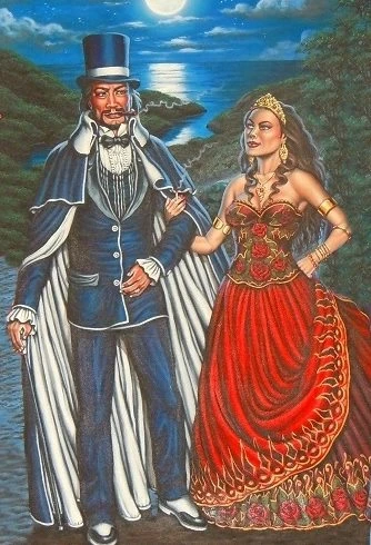 A rainha passou a tomar conta sozinha do seu reino o que deixou alguns membros da corte indignados porque ela não teve filhos para deixar o trono como herança e tampouco parentes sangue azul para substituí-la após a sua morte. Devido a tenacidade da rainha o seu trono começou a ser cobiçado por outros reinos o que trouxe muita preocupação para a política da corte, então o conselheiro real convenceu a Rainha a casar-se novamente com um homem cujo o reino fosse ainda maior que o seu para juntos vencerem as batalhas e trazer ao reinado a paz e a tranqüilidade que já não tinham mais. Um dia surgiu no castelo um homem que se dizia seduzido pela beleza da rainha e dono de um reinado incalculável no oriente e a pediu em casamento, a rainha preocupada com destino da sua corte e pela proteção de seu trono, aceitou a oferta de imediato e logo em seguida casaram-se. Não demorou muito a querida rainha foi envenenada pelo seu atual marido que logo após se titulou o Rei e começou a governar a corte da pior maneira possível. A saudosa rainha após o seu desencarne chegou ao mundo astral muito perdida e logo começou a habitar o limbo devido a faltas graves que na terra havia cometido. Depois de algum tempo na trincheira das trevas do astral a Rainha foi encontrada pelo seu antigo Rei que no astral era conhecido como Senhor das encruzilhadas, este senhor passou a cuida-la e incentiva-la a trabalhar do seu lado para as pessoas que ainda viviam no plano material aliviando suas dores e guerreando com inimigos astrais... O feito deste casal no astral tornou-se tão conhecido e respeitado que o Exu Belo nomeou o Senhor das encruzilhadas como Rei das Sete encruzilhadas e prontamente o Rei nomeou a sua Rainha. Juntos eles passaram a reinar os caminhos das trevas e da luz e sob o seus comandos milhares de entidades subordinadas que fizeram do Reino das sete encruzilhadas o maior reino do astral médio superior. Passou-se muitos anos e o Rei que havia envenado a rainha veio a morrer durante uma batalha, e este foi resgatado pelos soldados da Rainha das sete encruzilhadas e o mesmo foi levado até ela. O homem ainda atônico sem entender ainda o que estava acontecendo com ele, se viu diante daquela poderosa mulher a qual foi obrigado a curvar-se e a servi-la para o resto da sua eternidade como castigo por ter-la envenenado. E hoje através das suas histórias que compreendemos que o povo de Exu não são entidades perdidas do baixo astral e sim entidades respeitadas e de muita importância no mundo astral superior e inferior. A Pomba-Gira Rainha das Sete Encruzilhadas adora a cor Maravilha, Vermelho, Preto e Dourado trazendo na mão um cedro de ouro. Suas oferendas são sempre as mais caras, pois ela é muito exigente. A Pomba-Gira Rainha das 7 Encruzilhadas também é conhecida no sudeste do país como “Dona 7” se apresenta como uma mulher de meia idade, muito reservada, educada, iteligente e culta. Ao contrários que muitas pessoas pensam... é uma entidade calma e tranqüila, mais quando chega ao mundo para deixar seu recado, traz na garganta um grito de guerra onde expressa todo o seu poder de vitórias. Foi Iansã quem lhe deu força! Ela é a Rainha do Candomblé... Vamos sarava nossa Rainha Pomba-Gira ela é o exu mulher... Vamos sarava nossa Rainha Pomba-Gira ela é o exu mulher... bis... Saravá D.Rainha!